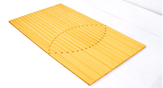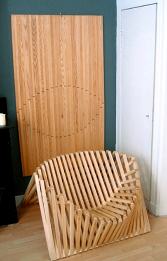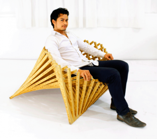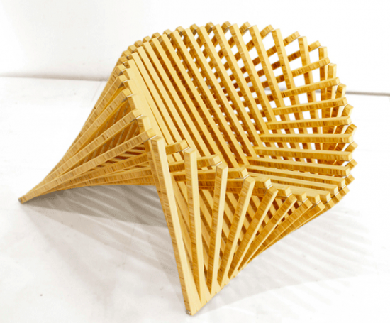 なんとこんな立体的な椅子になります。元の平らな状態からはとてもじゃないですが想像することが出来ません。幾何学模様がとっても素敵。人が座るとどうなるのかというと・・・