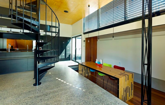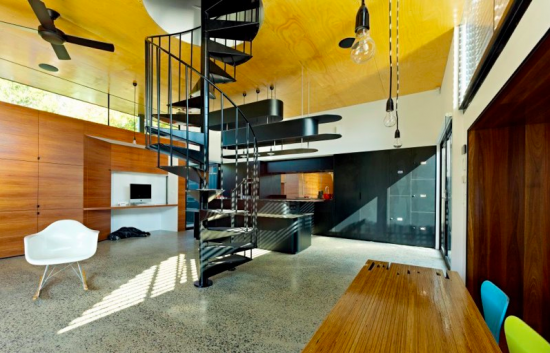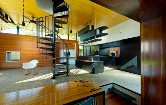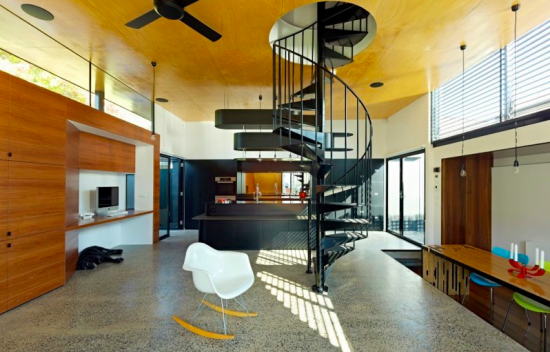 左側が芝生の中庭。そして右側がキッチン。中央には2階へと続く螺旋階段です。