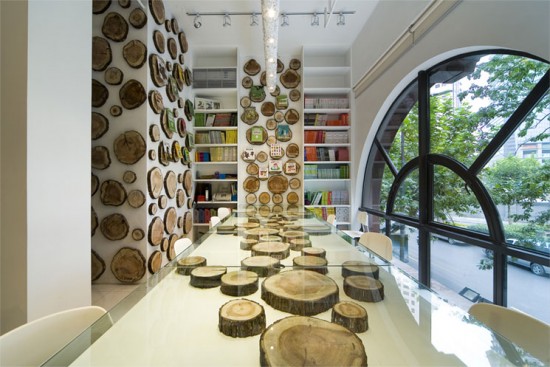 そう。イベントスペースである、かまくらをぬけるとそこはオフィスになっており机にはスライスされた丸太が敷き詰められ、それは壁へと続いています。