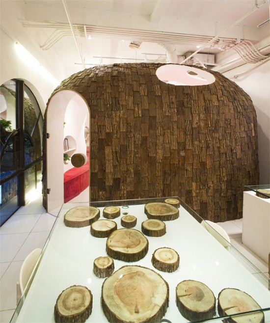 2階はイベントスペースとなっており、ざらざらの質感の木の皮に包まれたドームで構成されています。 内部はかまくらのような真っ白な空間となっており歪んだ円状の孔が天井を縁取っています。