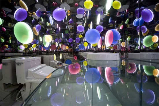 最後に、上の写真はトイレ。 一転して前面鏡面ステンレス張りの仕上げとなっています。照明を仕込んだカラフルな円と共に自分自身も写し出され、それが延々と続いていくようにデザインされています。