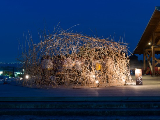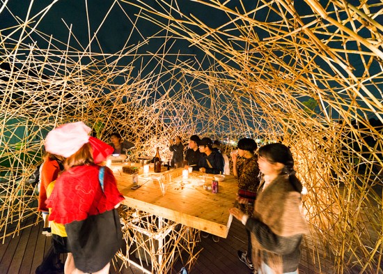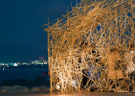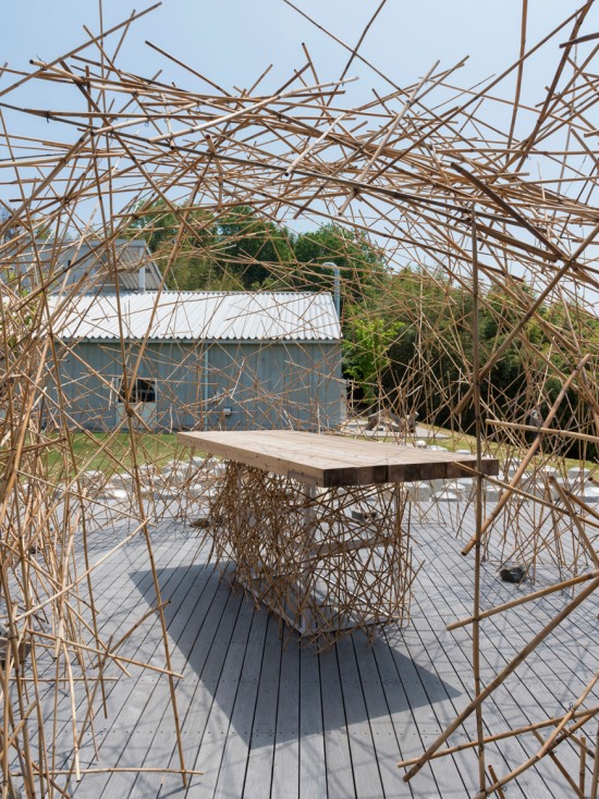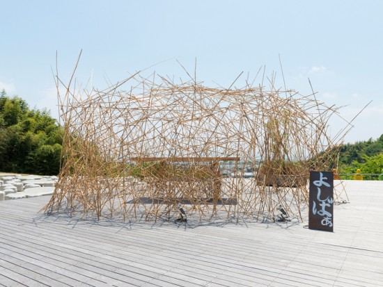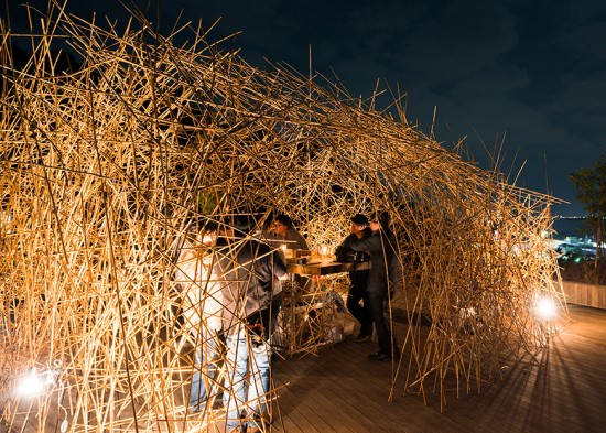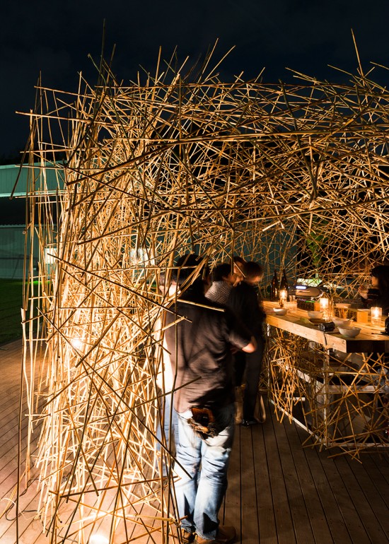 琵琶湖を眺める場所にある成安造形大学では、毎年「空間デザインクラス」の授業のカリキュラムのひとつとして、「葦」を使ったオブジェ制作の授業があるそうで、その技術とアイデアを「オブジェに人が使える機能を持たす」をコンセプトに再構築し制作されたのがこの「葦BAR」だそうです。