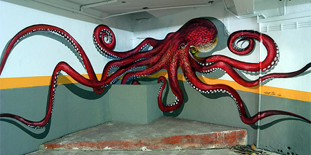 まずはこちら。突如巨大なタコが壁から出現したかのようなこの作品。夜、何気なく歩いている時に見付けてしまったらちょっと怖いかもしれませんね。