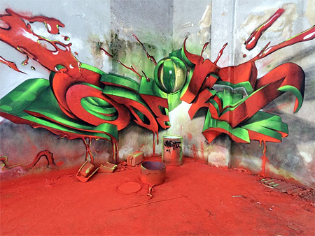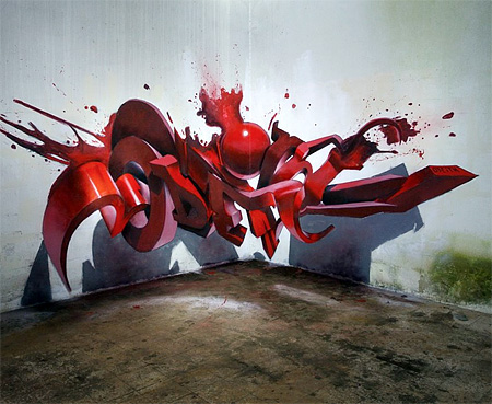 まるで壁から飛び出てしまったかのような文字の3Dストリートアート作品。地面いっぱいに赤いペンキがこぼれ落ちてしまっています。