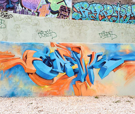 オレンジとスカイブルーの使い方が絶妙な3Dストリートアート作品。