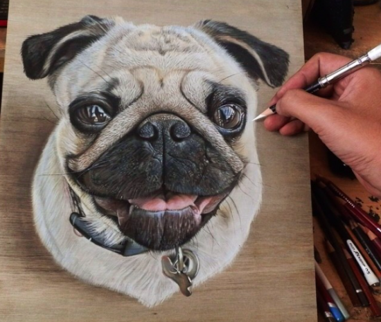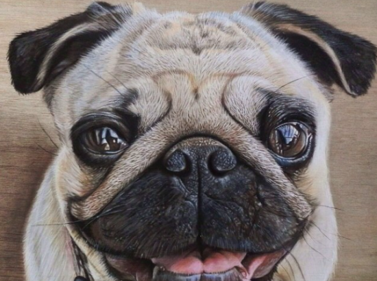 このフレンチブルドッグも色鉛筆で描かれたもの。鼻の辺りの質感なんてもう本物そっくり。今にも動き出しそうな絵です。