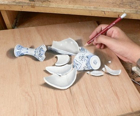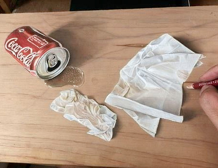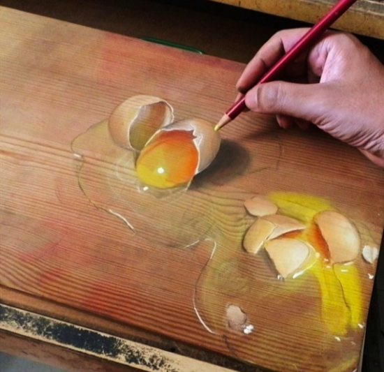 本物に見えますが、ご覧の通り正真正銘色鉛筆を使って机に描かれた絵です。