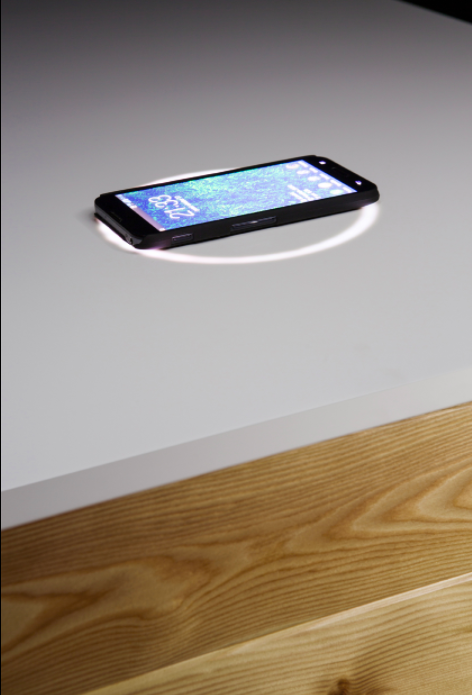 最新のテクノロジーが備え付けられた、デスクの上に置くだけで充電する事が可能な、銀色ボディーの美しいワイヤレス充電デスク「Katedra office desk」