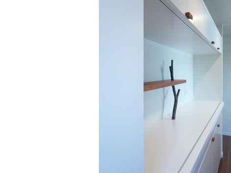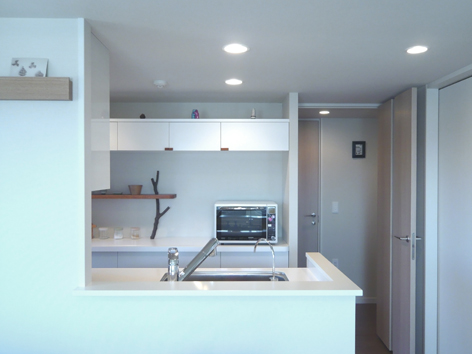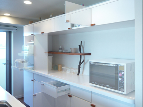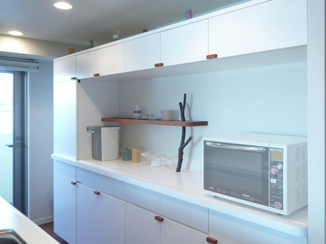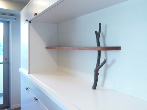 ケヤキの木を食器棚に貫通させただけの非常にシンプルなデザインなのですが、この真っ白の空間に非常に調和し、暖かな空間に仕上がっています。