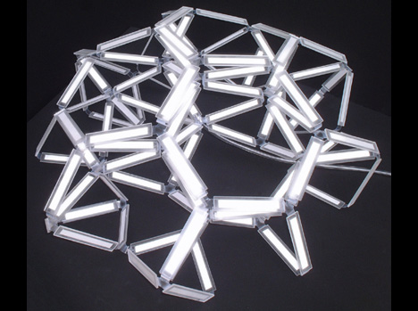 薄く、熱が少なく、紫外線を出さない新しい光源である「有機EL」を使い、フロアランプやシャンデリアにもなり、まるで布や網のように自在に変化するデザインをうみだしたのはデザイナーの小泉忍氏。