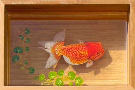 樹脂を型に流し込み、立体的な金魚の絵を描く作品から、金魚の絵画まで、金魚に関する作品なら彼の右に出る作品は無いのではないかと思うほど素晴らしい作品を数多く手がけています。