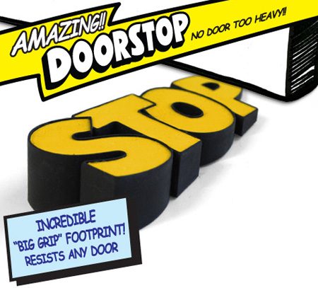アメリカンコミックに出てきそうな文字のドアストッパー「Stop Doorstop」。コミックマンガでこうした文字がよく出てきますよね。