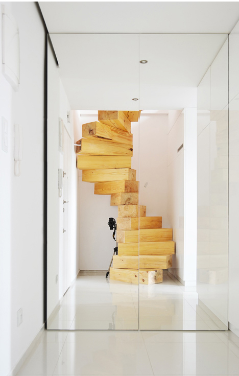 上の写真がジェンガのような螺旋階段。小さなアパートにすっぽりとおさまったこのジェンがの積み木のような螺旋階段。