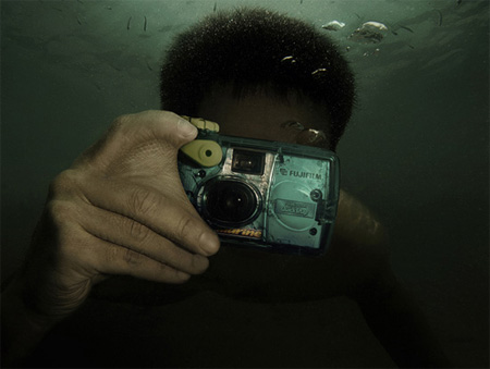 水の中でも撮れることを強調した富士フィルムのクイックスナップの広告。