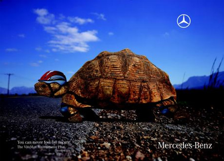 「You can never feel too secure」メルセデスベンツの安全な車だと訴えかける広告。
