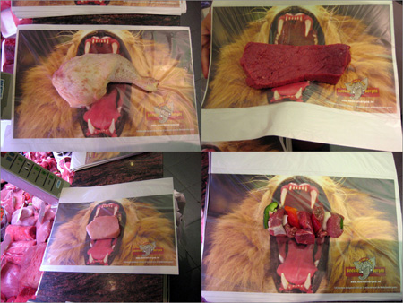 肉食動物がお肉にかぶりついているかのような広告。