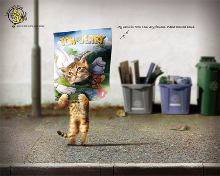 「My name is Tom, I am very famous. Please take me home」僕を連れてかえってという猫倶楽部の広告。