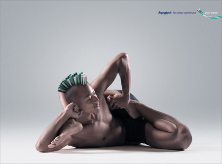 ヨガの広告かと思いきや・・・実はアクアフレッシュ歯ブラシの広告。しなやかに曲がるということを主張しているものだと思われます。
