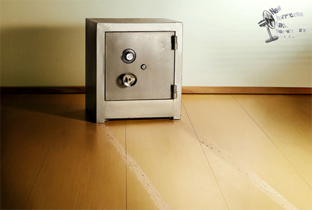 Hurricane Fanの広告。Hurricane Fanによって重たい金庫が動いてしまっています。