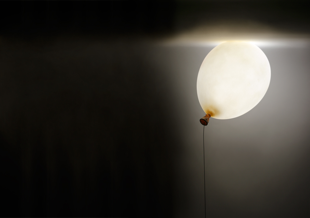 Balloon Benchの派生であるこの照明はその一例です。天井で行き場を失った風船を浮遊感を維持したまま照明として機能させ、風船の儚さに照明器具という固定的な機能が加わる事で生まれる対称性に面白さを感じ形にしています。