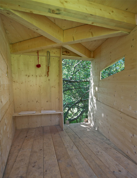 奥の梯子からこのツリーハウスの中に昇っていきます。