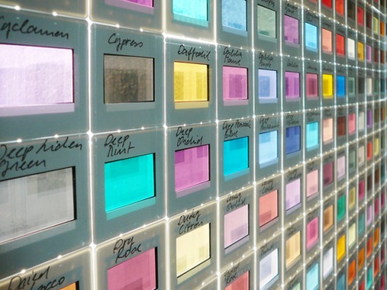 実はこの扉、PANTONE(パントン)の色見本で出来ているそうです。ステンドグラスドアを拡大した画像ではきちんとその色の名前が入っています。