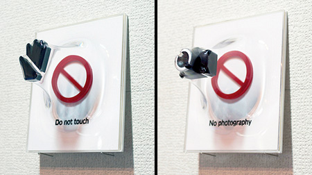 こちらは「触るな」と「写真を撮るな」の標識。立体的に浮きだたせる演出により、相キャッチは抜群。