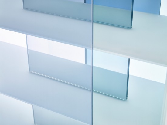 ガラスの色彩が重なり合うことで様々な表情を見せるガラスのキャビネット「layers」