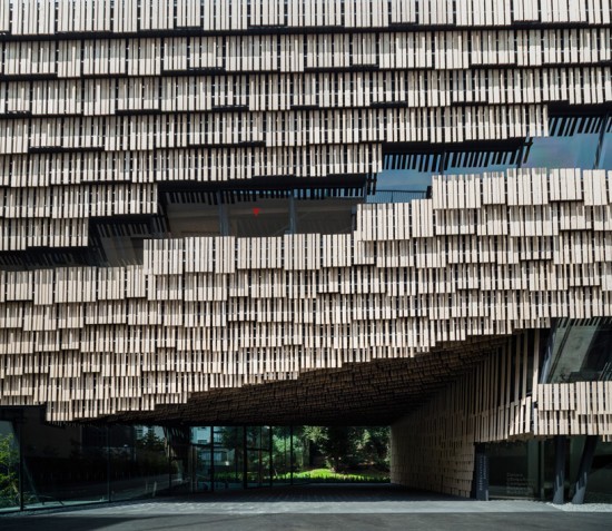 隈研吾氏らしい自然素材を生かした建築や、格子を多用したデザインが目をひくファサード。