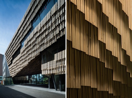 なんでもコンクリートや金属、石などの硬質材料からなるキャンパスのイメージを払拭し、木と土などの天然素材でつくられたソフトな建物をということで設計されたのだそう。