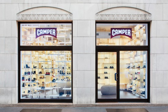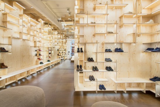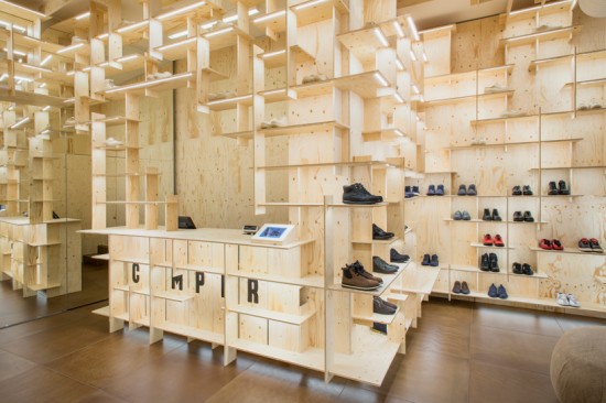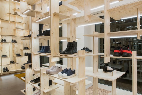 kengo kuma delineates milan camper store with gridded plywood shelves