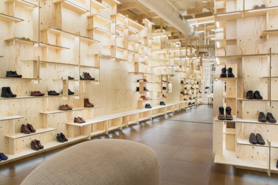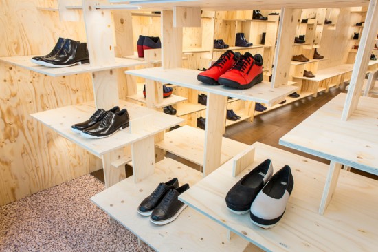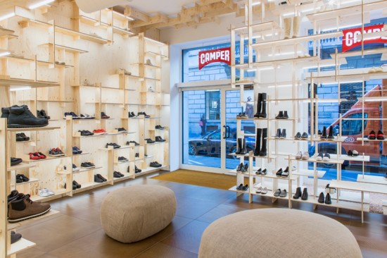 安価な合板でつくった、やわらかでヒューマンな「雲」とCAMPERの靴の哲学とが響きあっており非常に明るい店内に仕上がっています。