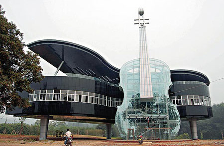 中国の安徽省(あんきしょう)にあるピアノとギターの形をしたビル。
