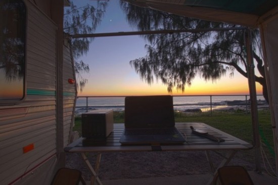 沈み行く夕陽を眺めながらトレーラーで・・・個人的にはこんなところで仕事がしたい・・・。