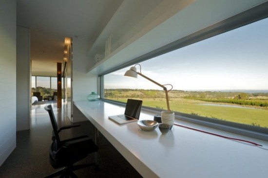 部屋の真ん中にデスクがあり、その先にはなんと海。