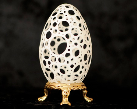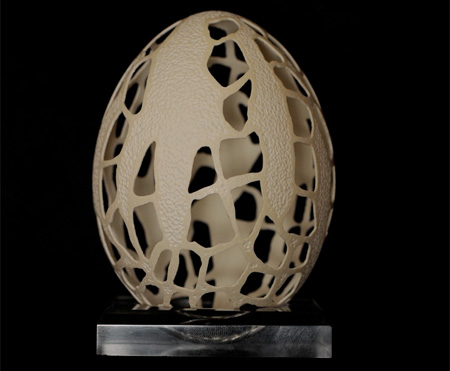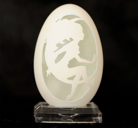 何とも不思議な、卵の殻をカービングしてつくった作品。卵の形はとどめたままで、カービングをしてつくったこの作品。