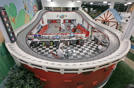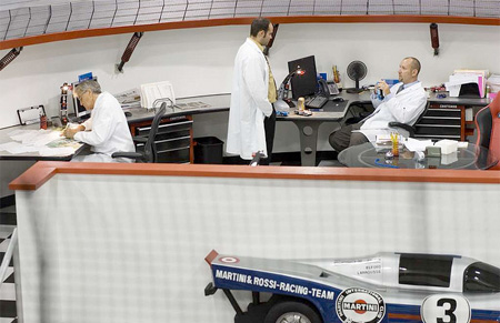続いまるでてサーキットのようなオフィス。ちょっと目がチカチカしますね。近づいてオフィスの中をみてみると・・・。