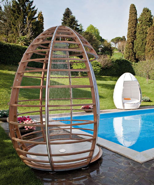 実はこれ、オプションでシャワーを取り付けることが出来ます。プールサイドに置けば写真のようにシャワールームにも早変わり。