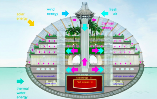 しかも、風力、太陽光、水力、地力などをエネルギーとして取り入れることができる設計がされているというエコ仕様。建物内に水や酸素、電気を貯めながら、独立したエネルギー供給をすることができます。