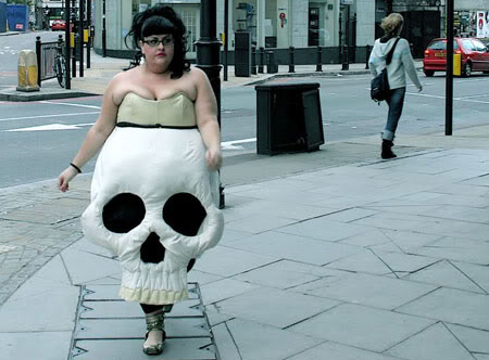 ガイコツの形をしたドレス。写真の女性もちょっと不気味。