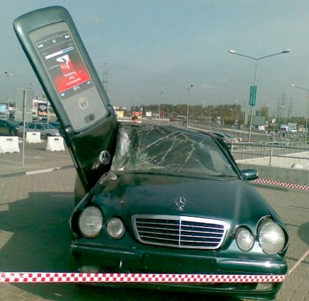こちらはモトローラの携帯電話の広告。車に携帯電話が突っ込んでいます。