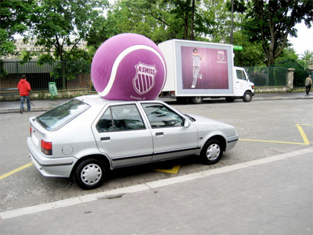 テニスのボールが車の上に・・・よくみると遠くの方でテニスをしているひとの広告が・・・。