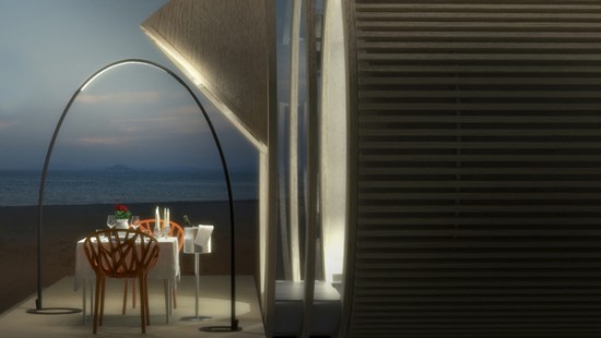 ビーチに設置して写真のようにテーブルを設置すればなんともおしゃれな即席レストランへ。