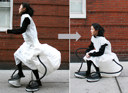 歩くことでお尻に空気が溜まり、座ることが出来るタイプの椅子。詳しくは下の動画をご覧下さい。