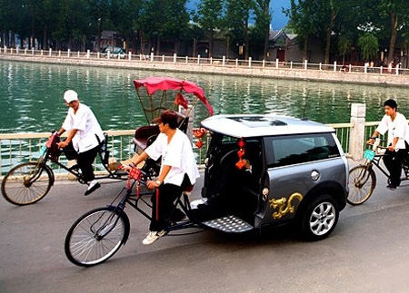 半分こにされたミニクーパーが自転車で運ばれています。いつもとは違った気分で利器シャーに乗ることが出来そうですね。