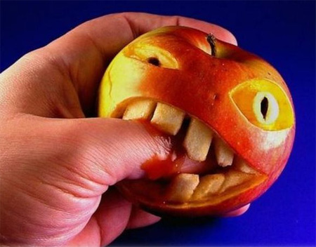 リンゴを利用した作品。リンゴにより手が食べられているかのような作品に仕上がっています。