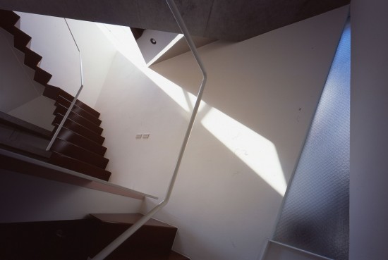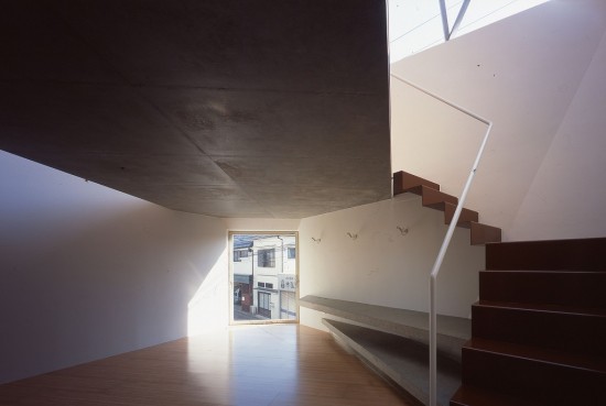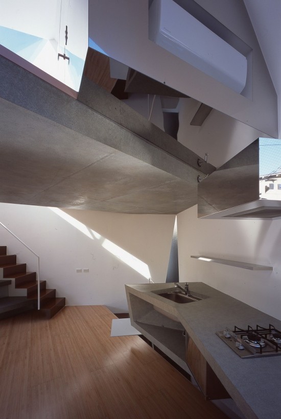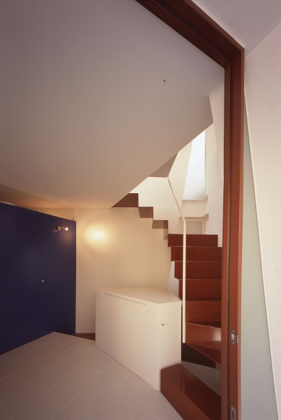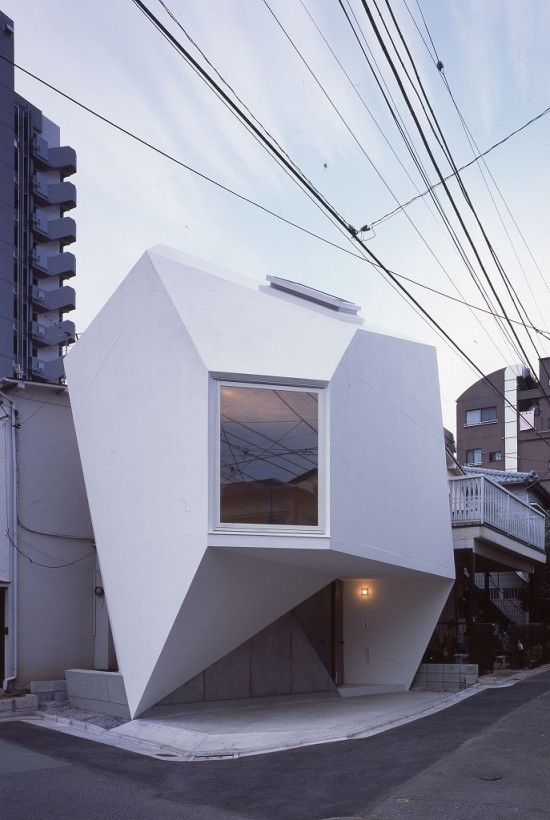 5.15mと3.7mの幅員のふたつの道路に鋭角にはさまれた44.62㎡の小さな変形敷地に建てられたこの奇妙な形をした家。