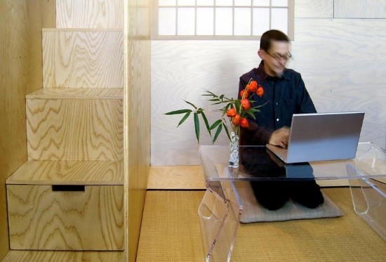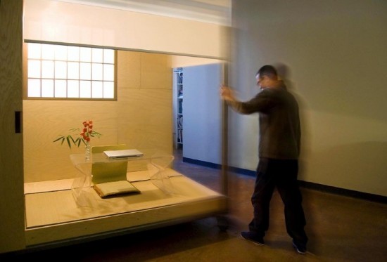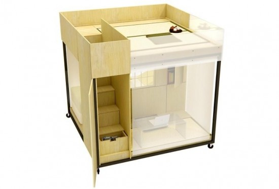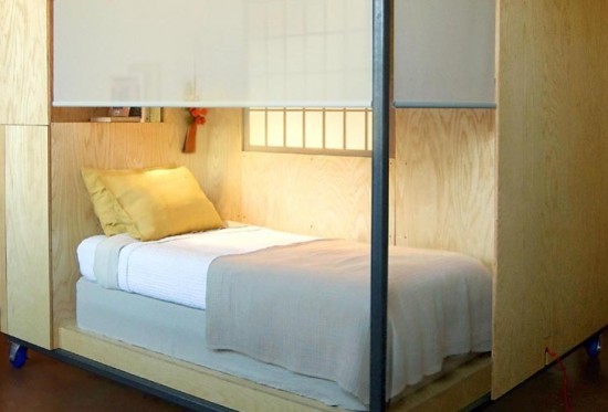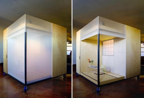ベッド、書斎、茶室がこのキューブの中に機能として凝縮されています。移動式なのもプラスポイント。