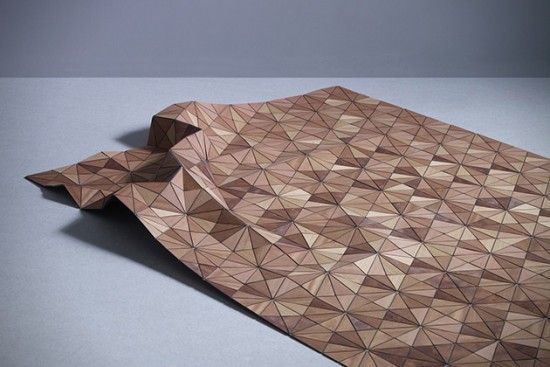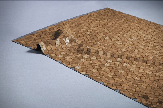 Elisa Strozyk氏による「Wooden Carpet」は、三角形と四角形の二種類の形の木材が敷き詰められたカーペット。