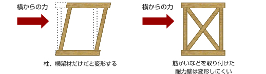 一般的に建物は真上からの重さに対しては、柱で支えることが出来るので優れていますが、横からの力には非常に弱い傾向があります。